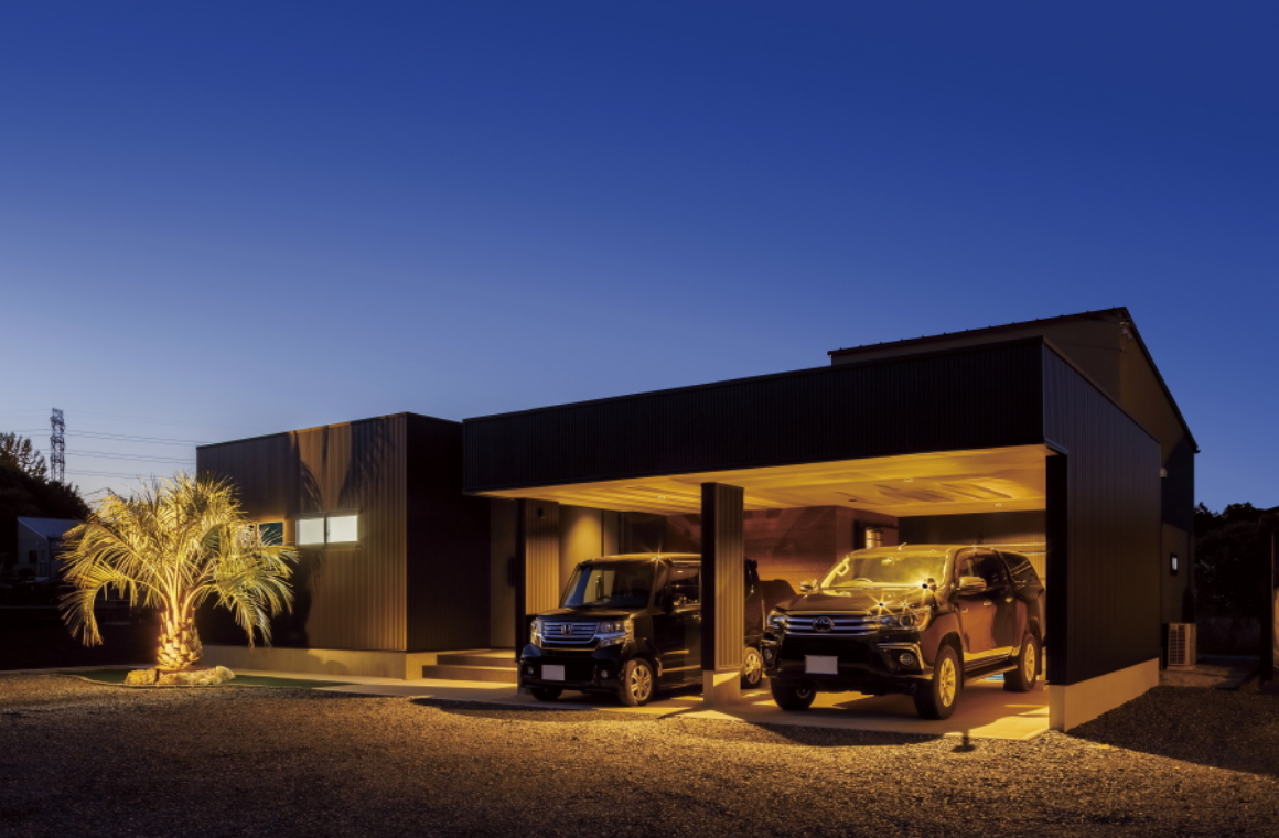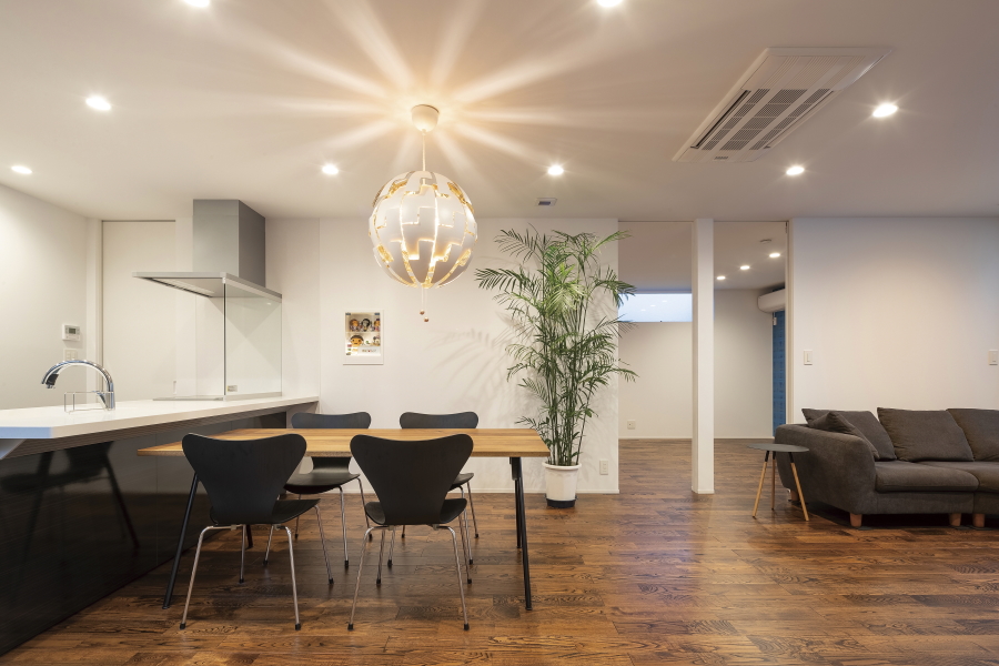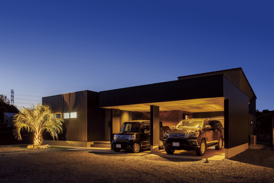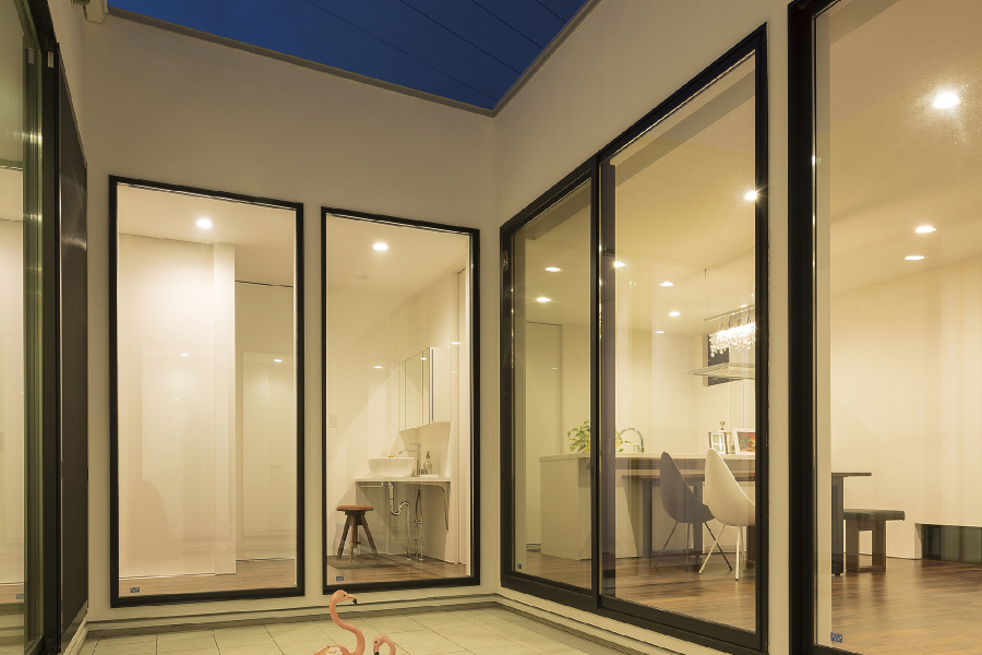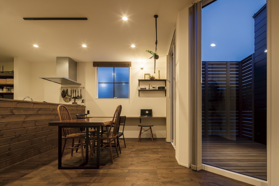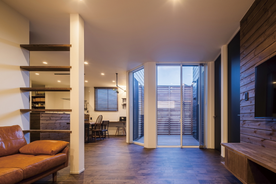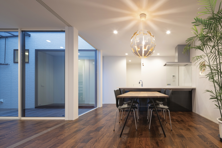 外壁には、黒ガルバをベースとし、無垢材のレッドシダーをアクセントに採用しました。夜間に光がもれる格子窓も建物に印象を与えています。室内は、落ち着いた色の床材がお好みのため、お部屋が暗くならないよう中庭を設け、極力無駄なスペースとなる廊下を排し、LDKを広くすることで開放感のある間取りにしました。