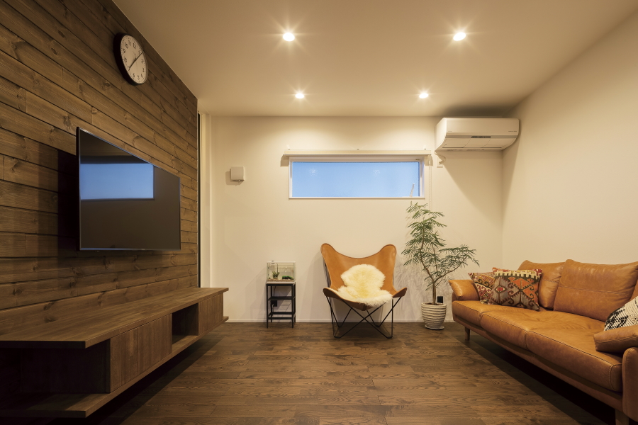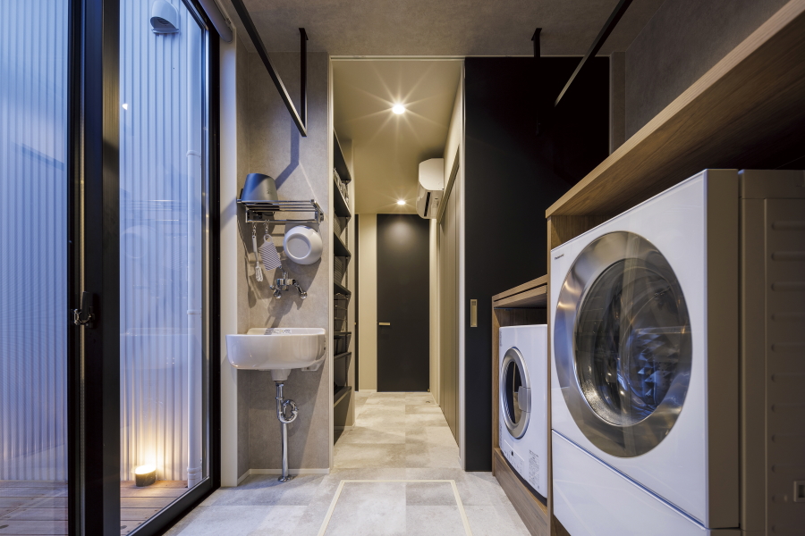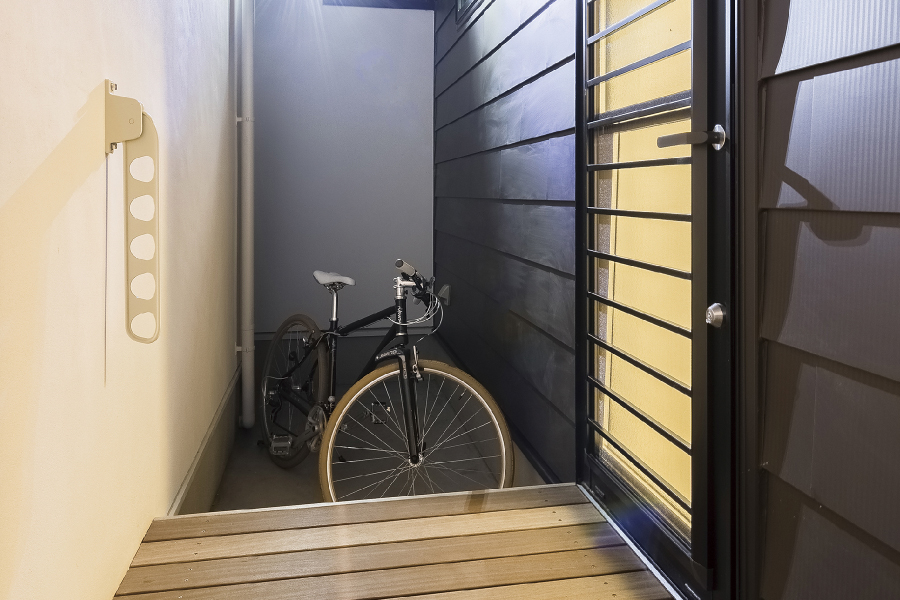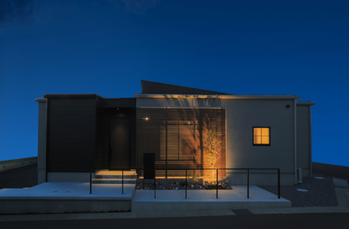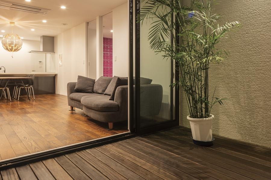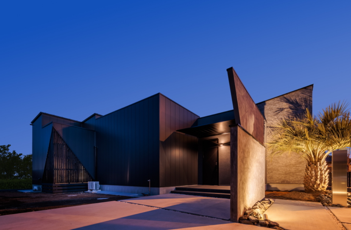 外壁には、黒ガルバをベースとし、無垢材のレッドシダーをアクセントに採用しました。夜間に光がもれる格子窓も建物に印象を与えています。室内は、落ち着いた色の床材がお好みのため、お部屋が暗くならないよう中庭を設け、極力無駄なスペースとなる廊下を排し、LDKを広くすることで開放感のある間取りにしました。