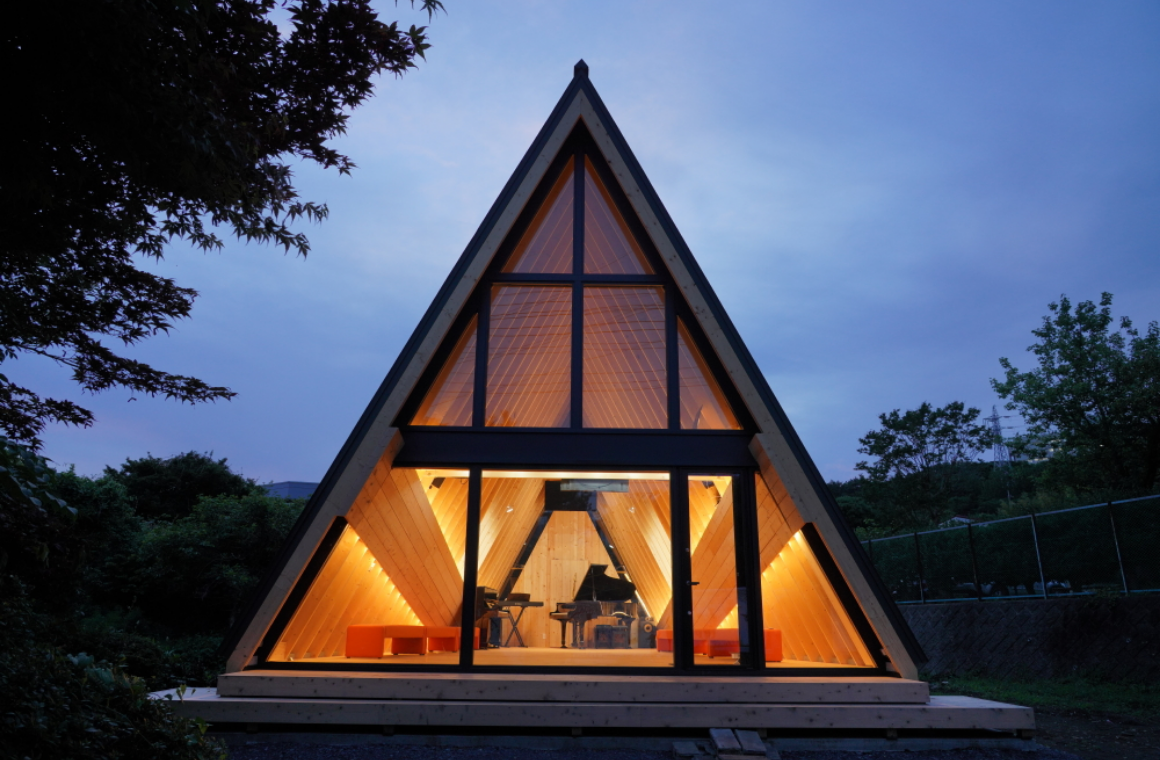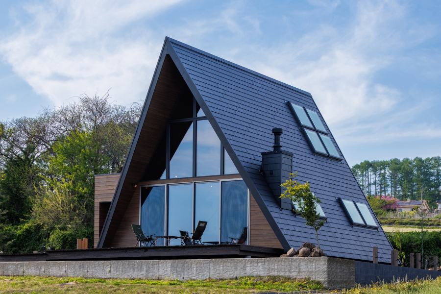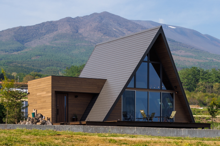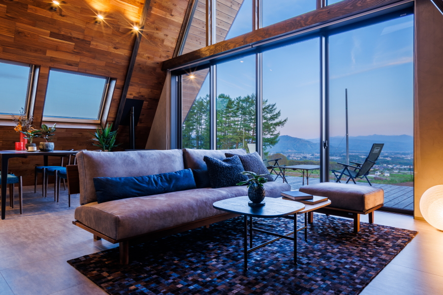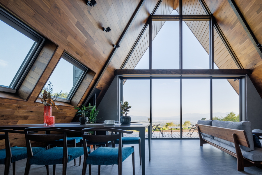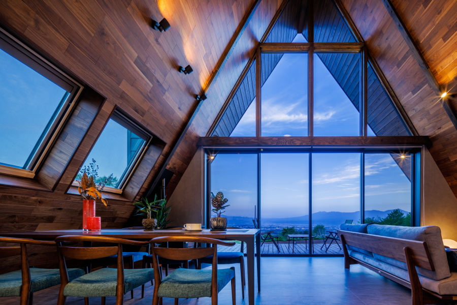 北米を中心に世界で建設されている三角の家(A-frame工法)は自然との繋がりを強く実感できる建物です。最大の特徴である三角の大開口から絶景を眺め、優雅なひと時を過ごすことができる家をモデルルームとして建造しました。