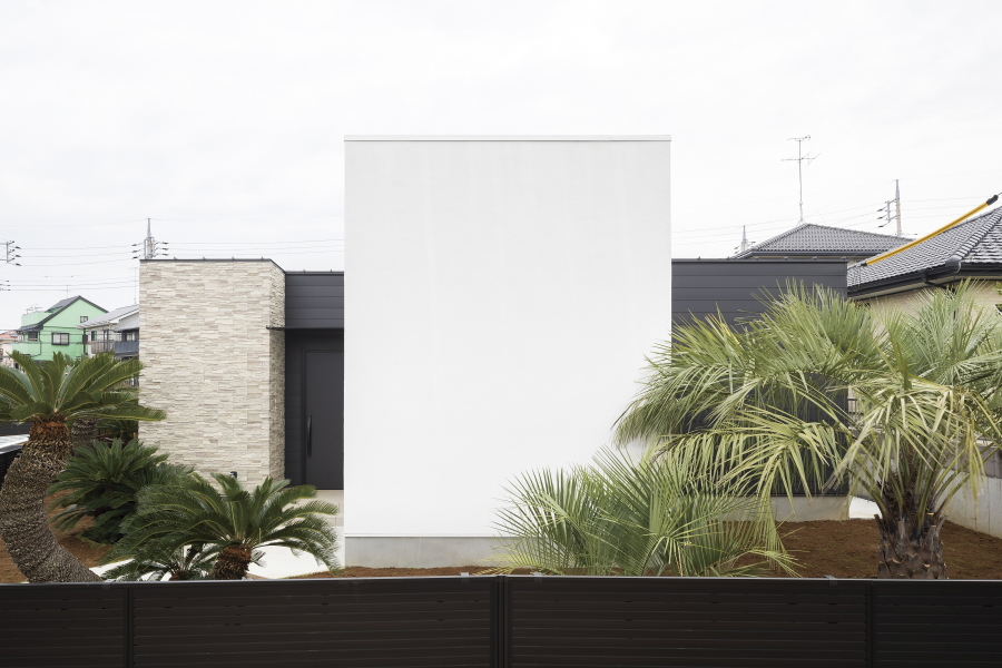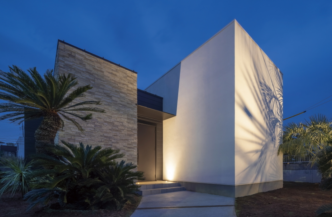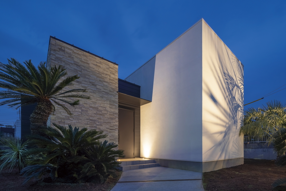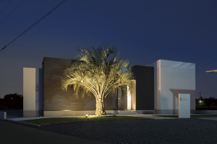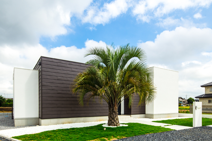 住宅地の中で一際存在感を放つT様邸の住まい。玄関へと導かれるように整えられた美しいアプローチ。ココスヤシやソテツを植えた庭が、リゾート地のような上質な雰囲気を創出します。